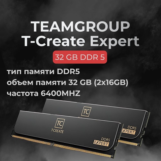 Модуль памяти DIMM DDR5 32Gb, 6400Mhz, 2x16Gb, Team Group T-CREATE Expert Black (CTCED532G6400HC32ADC01)Оперативная память Team Group T-CREATE Expert Black представляет собой модуль памяти DDR5 объемом 32 ГБ, состоящий из двух 16-гигабайтных модулей.Модуль памяти оснащен радиатором, который обеспечивает эффективное охлаждение и продлевает срок службы компонентов.Частота памяти составляет 6400 МГц, что обеспечивает высокую скорость обработки данных и позволяет запускать ресурсоемкие приложения без задержек.Пропускная способность модуля памяти составляет 51200 МБ/с, что гарантирует быструю и стабильную работу системы.Напряжение питания составляет 1.35 В, что делает модуль памяти совместимым с большинством материнских плат.Цвет товара – черный, что позволяет ему гармонично вписаться в любой интерьер.В комплекте поставки вы найдете два модуля памяти, что позволит вам увеличить объем оперативной памяти вашего компьютера.Выбирая модуль памяти DIMM DDR5 32Gb, 6400Mhz, 2x16Gb, Team Group T-CREATE Expert Black, вы получаете надежный и производительный компонент для вашего компьютера, который обеспечит стабильную работу и высокую производительность.